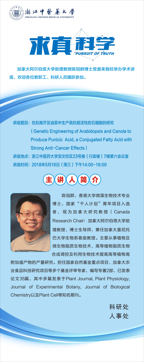讲座预告:在拟南芥及油菜中生产具抗癌活性的石榴酸的研究