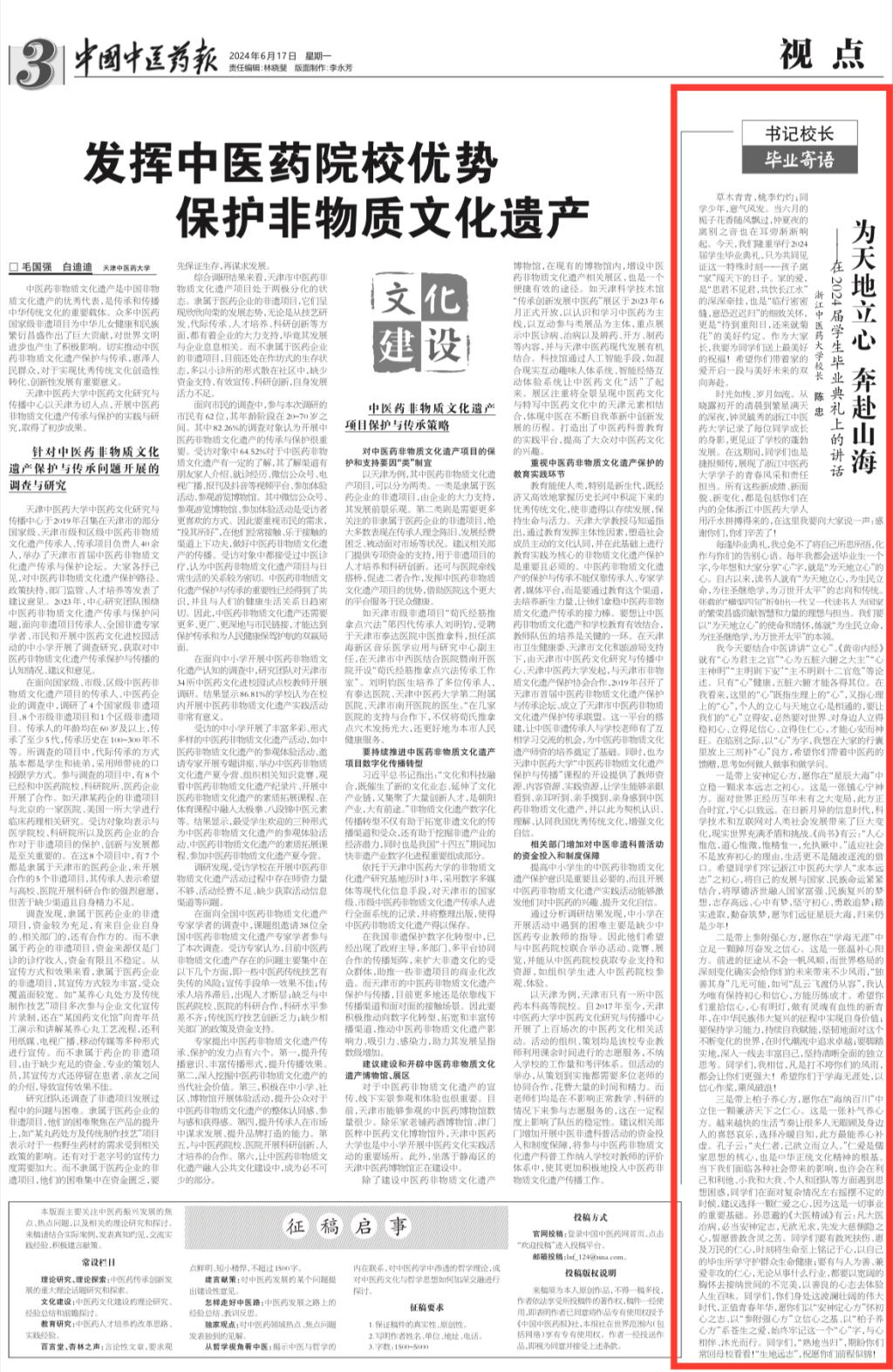 中国中医药报、中国中医药网:为天地立心 奔赴山海 ——在2024届学生毕业典礼上的讲话