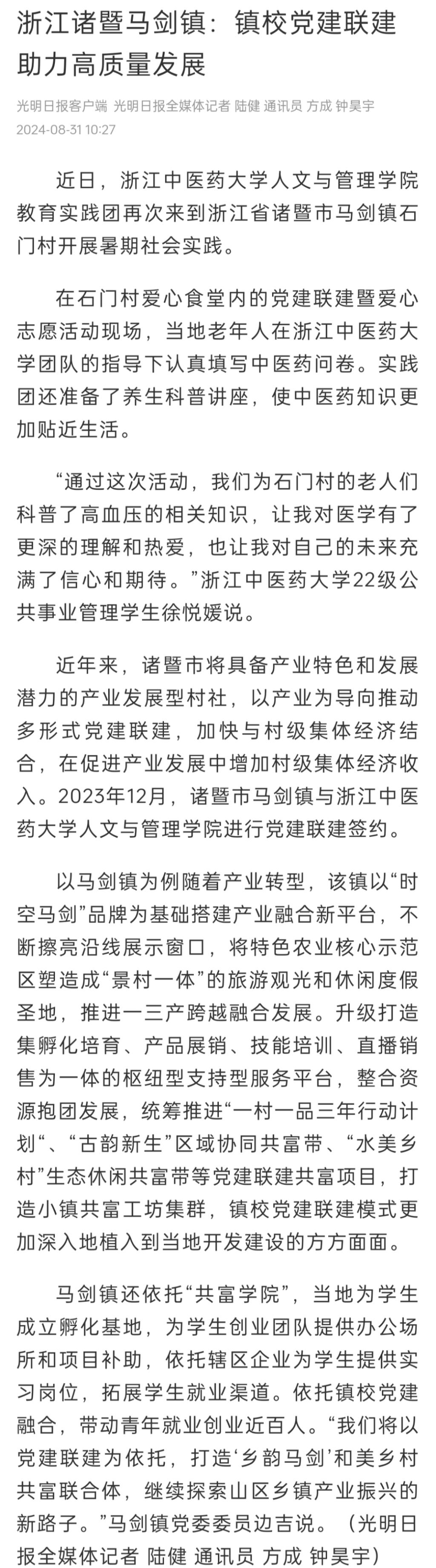 马剑镇还依托“共富学院”,当地为学生成立孵化基地,为学生创业团队提供办公场所和项目补助,依托辖区企业为学生提供实习岗位,拓展学生就业渠道。依托镇校党建融合,带动青年就业创业近百人。“我们将以党建联建为依托,打造‘乡韵马剑’和美乡村共富联合体,继续探索山区乡镇产业振兴的新路子。”马剑镇党委委员边吉说。