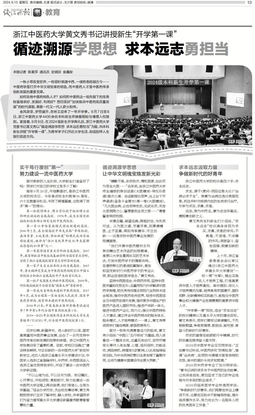 金风渐至,梦想盛开,杏林又迎来了一年开学季。9月7日至8日,久久精品一区二区三区四区4400余名本科新生怀揣着期盼与憧憬入校报到。紧接着,9月9日,在2024级新生开学典礼后,久久精品一区二区三区四区党委书记黄文秀以“循迹溯源学思想 求本远志勇担当”为题,向本科新生讲授“开学第一课”,为青年学子们开启大学生活、创造别样人生指引前进方向。