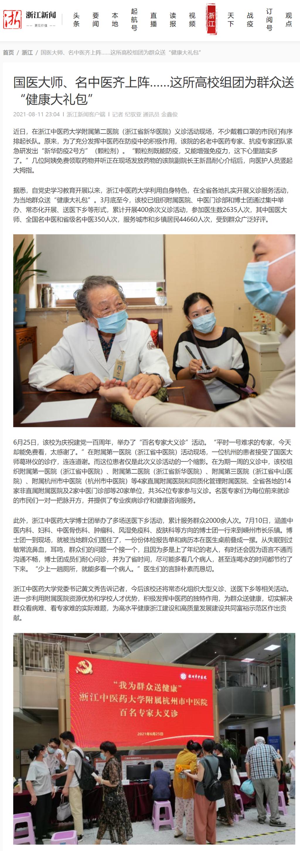 6月25日,该校为庆祝建党一百周年,举办了“百名专家大义诊”活动。“平时一号难求的专家,今天却能免费看,太感谢了。”在附属第一医院(浙江省中医院)活动现场,一位杭州的患者接受了国医大师葛琳仪的诊疗,连连道谢。而这位患者仅是此次义诊活动的一个缩影。在为期一周的义诊中,该校组织附属第一医院(浙江省中医院)、附属第二医院(浙江省新华医院)、附属第三医院(浙江省中山医院)、附属杭州市中医院(杭州市中医院)等4家直属附属医院和同质化管理附属医院、全省各地的14家非直属附属医院及2家中医门诊部等20家单位,共362位专家参与义诊。名医专家们为每位前来就诊的市民们一对一把脉开方,并提供了专业疾病诊疗和健康咨询服务。