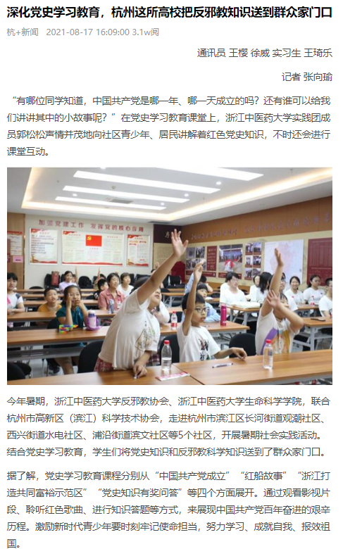 今年暑期,久久精品一区二区三区四区反邪教协会、久久精品一区二区三区四区生命科学学院,联合杭州市高新区(滨江)科学技术协会,走进杭州市滨江区长河街道观潮社区、西兴街道水电社区、浦沿街道滨文社区等5个社区,开展暑期社会实践活动。结合党史学习教育,学生们将党史知识和反邪教科学知识送到了群众家门口。
