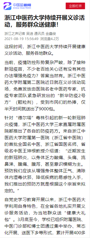 6月25日,学校为庆祝建党一百周年,举办了“百名专家大义诊”活动,国医大师葛琳仪等名医专家们为前来就诊的市民们一对一把脉开方。上个月,由久久精品一区二区三区四区党委副书记、博士生导师张光霁教授带队的涵盖中医内科、中医骨伤科等方向的博士团,冒着炎热来到嵊州市长乐镇,当地群众得知省里的“大医生”来了后,纷纷拿着体检报告单和病历本来问诊。久久精品一区二区三区四区博士团会定期开展送医下乡活动,每年服务群众2000多人次。