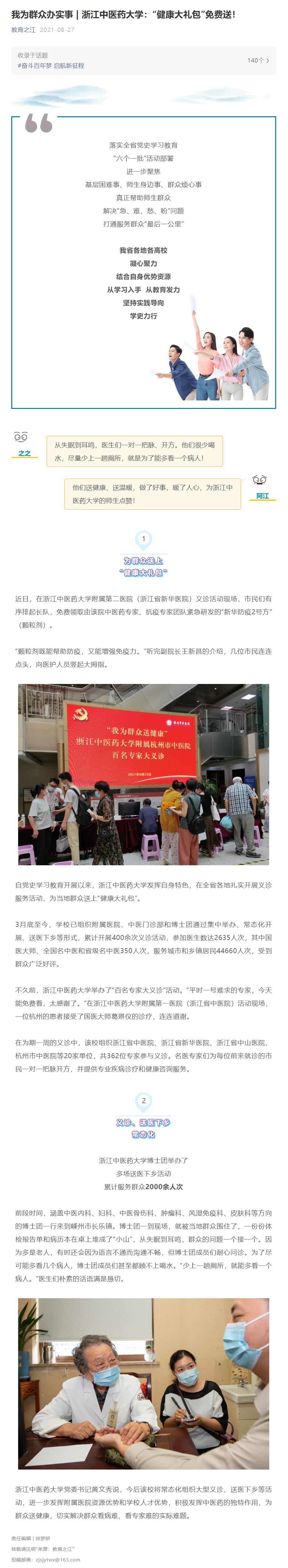 在为期一周的义诊中,该校组织浙江省中医院、浙江省新华医院、浙江省中山医院、杭州市中医院等20家单位,共362位专家参与义诊。名医专家们为每位前来就诊的市民一对一把脉开方,并提供专业疾病诊疗和健康咨询服务。