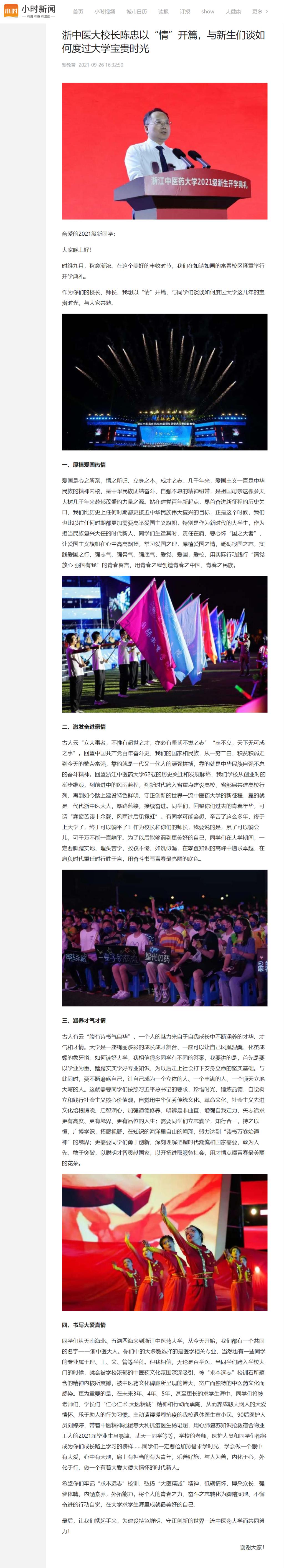 同学们从天南海北、五湖四海来到久久精品一区二区三区四区,从今天开始,我们都有一个共同的名字——浙中医大人。你们中的大多数选择的是医学相关专业,当然也有一些同学的专业属于理、工、文、管等学科。但我相信,无论是否学医,当同学们跨入学校大门的时候,就会被学校浓郁的中医药文化氛围深深吸引,被“求本远志”校训石所蕴含的精神内核所震撼,被中医药文化碑廊所呈现的博大、宽广而独特的中医药文化而感染。更为重要的是,在未来3年、4年、5年,甚至更长的求学生涯中,同学们将被老师们、学长们“仁心仁术 大医精诚”精神和行动而熏陶,从而养成悲天悯人的大爱情怀、乐于助人的行为习惯。主动请缨援鄂抗疫的我校退休医生黄小民、90后医护人员刘婷婷,带着中医精神驰援意大利抗疫医生杨珺超,用心肺复苏知识抢救宿舍物业工人的2021届毕业生吕易津、武天一同学等等,学校的老师、医护人员和同学们都将成为你们成长路上学习的榜样……同学们一定要倍加珍惜求学时光,学会做一个眼中有大爱,心中有天地,肩上有担当的有为青年,乐善好施,与人为善,内化于心,外化于行,做一个有着大爱大德大情怀的时代新人。