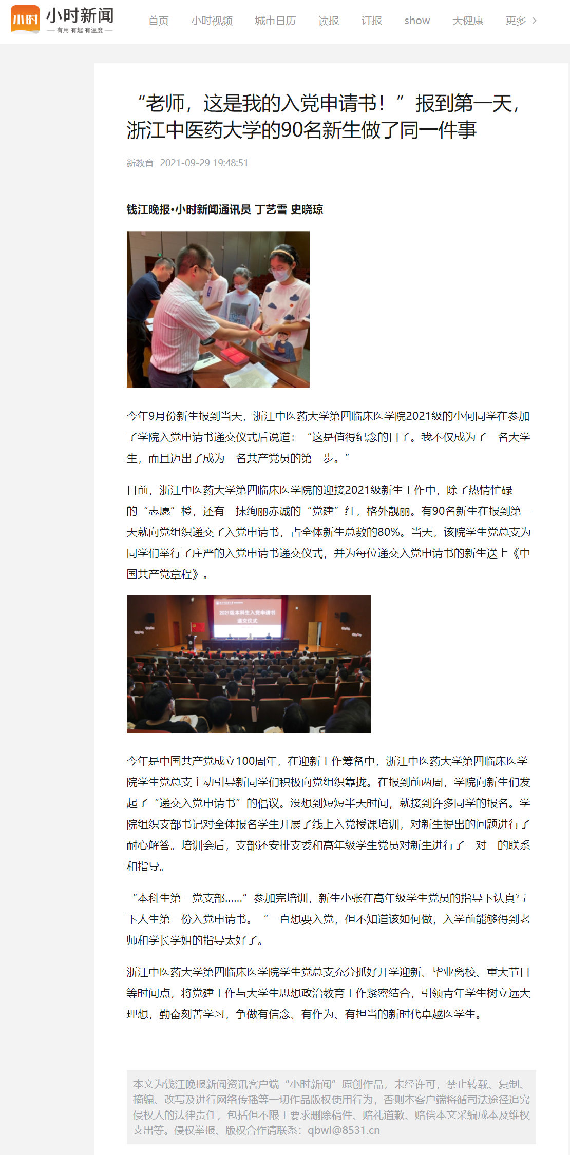 今年9月份新生报到当天,久久精品一区二区三区四区第四临床医学院2021级的小何同学在参加了学院入党申请书递交仪式后说道:“这是值得纪念的日子。我不仅成为了一名大学生,而且迈出了成为一名共产党员的第一步。”