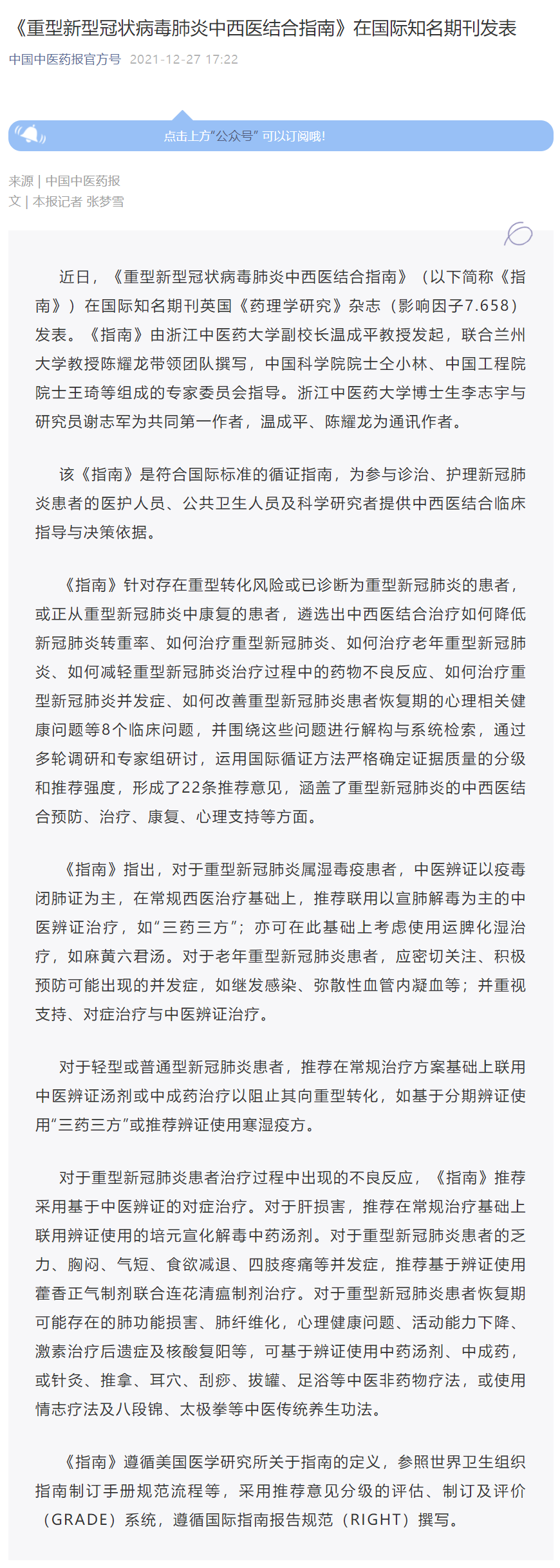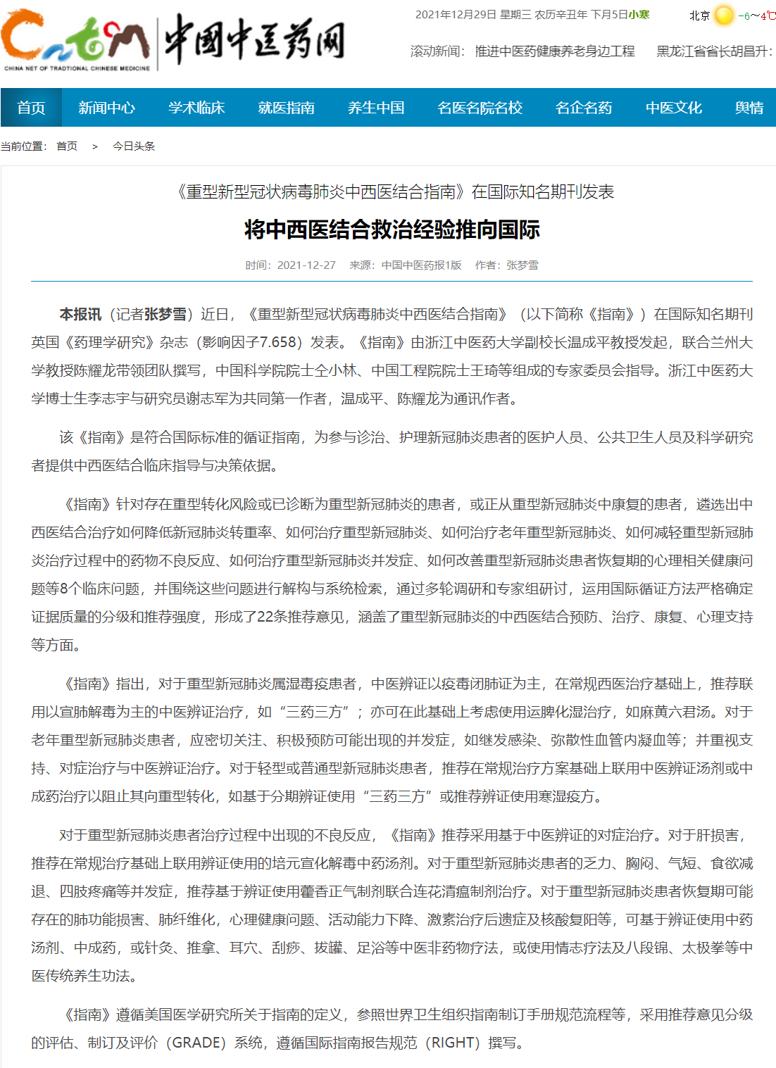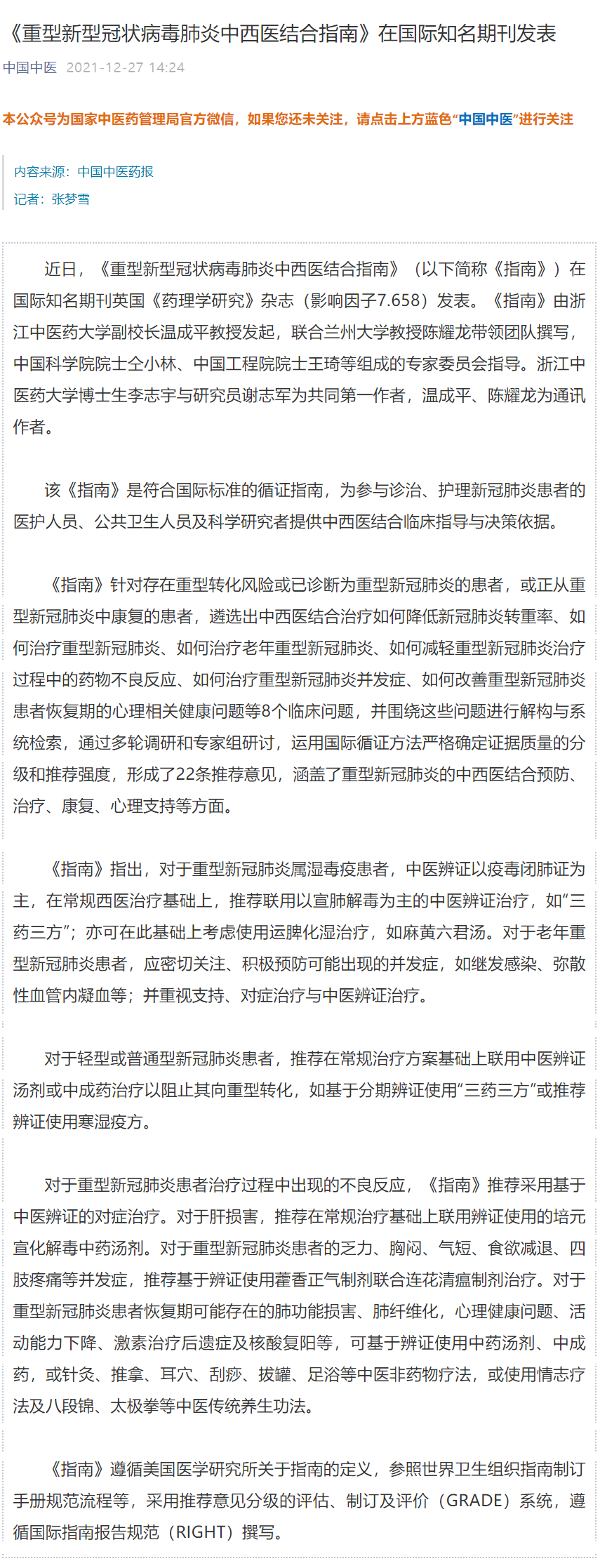 中国中医药报、中国中医药网、中国中医:《重型新型冠状病毒肺炎中西医结合指南》在国际知名期刊发表 将中西医结合救治经验推向国际