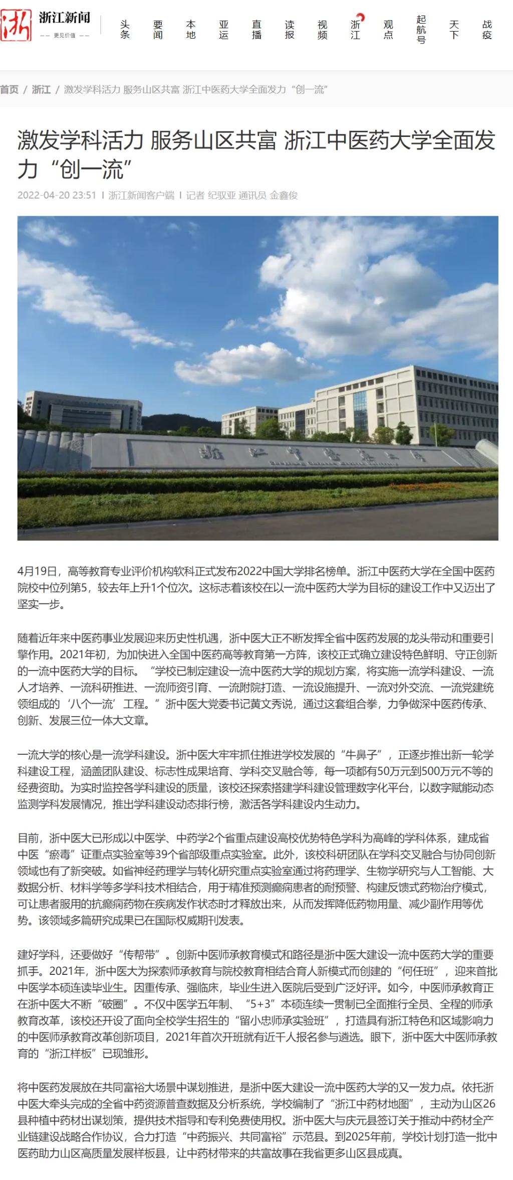随着近年来中医药事业发展迎来历史性机遇,浙中医大正不断发挥全省中医药发展的龙头带动和重要引擎作用。2021年初,为加快进入全国中医药高等教育第一方阵,该校正式确立建设特色鲜明、守正创新的一流中医药大学的目标。“学校已制定建设一流中医药大学的规划方案,将实施一流学科建设、一流人才培养、一流科研推进、一流师资引育、一流附院打造、一流设施提升、一流对外交流、一流党建统领组成的‘八个一流’工程。”浙中医大党委书记黄文秀说,通过这套组合拳,力争做深中医药传承、创新、发展三位一体大文章。