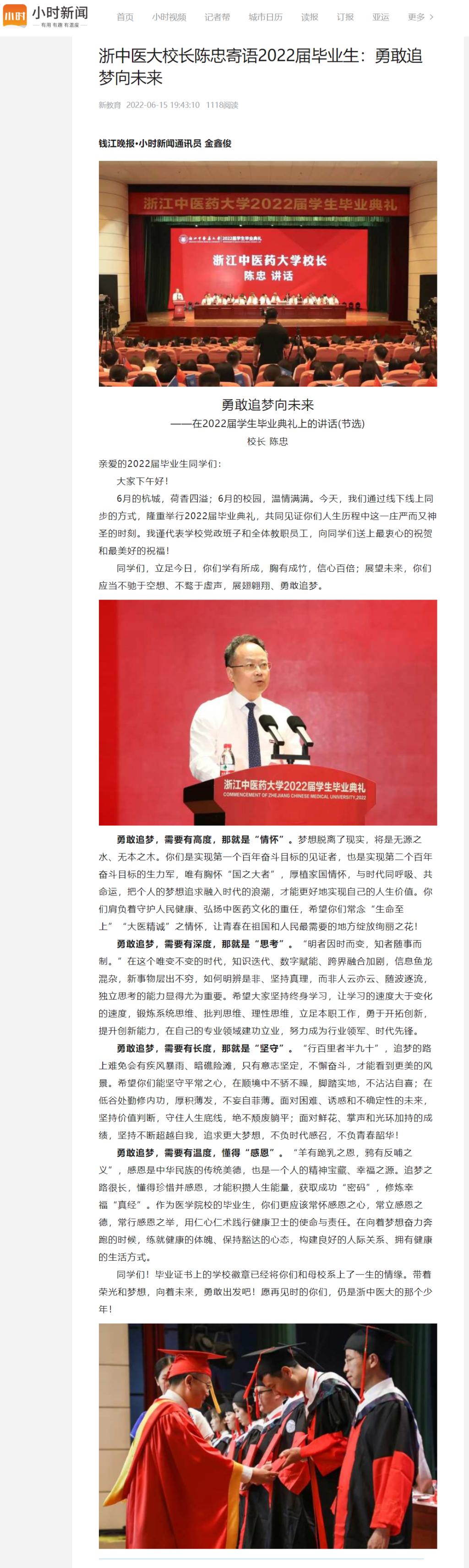 浙中医大校长陈忠寄语2022届毕业生:勇敢追梦向未来