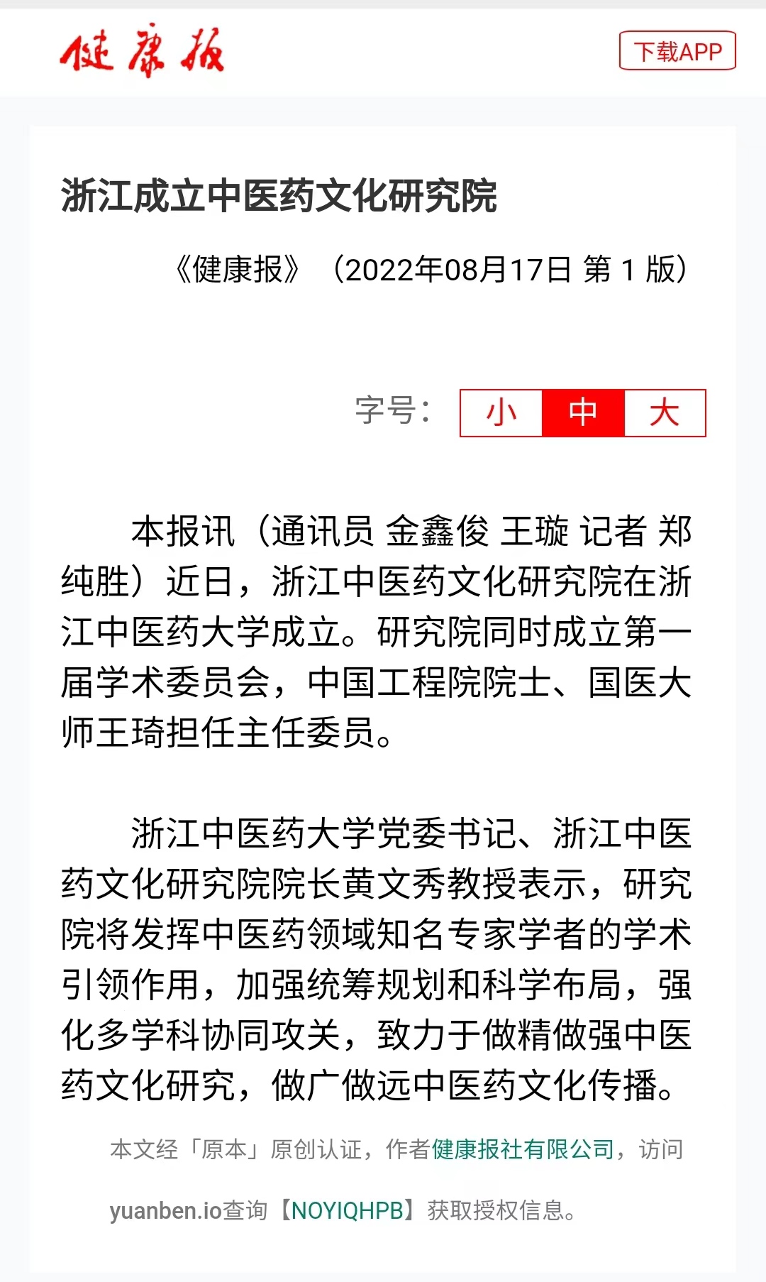 本报讯(通讯员 金鑫俊 王璇 记者 郑纯胜)近日,浙江中医药文化研究院在久久精品一区二区三区四区成立。研究院同时成立第一届学术委员会,中国工程院院士、国医大师王琦担任主任委员。