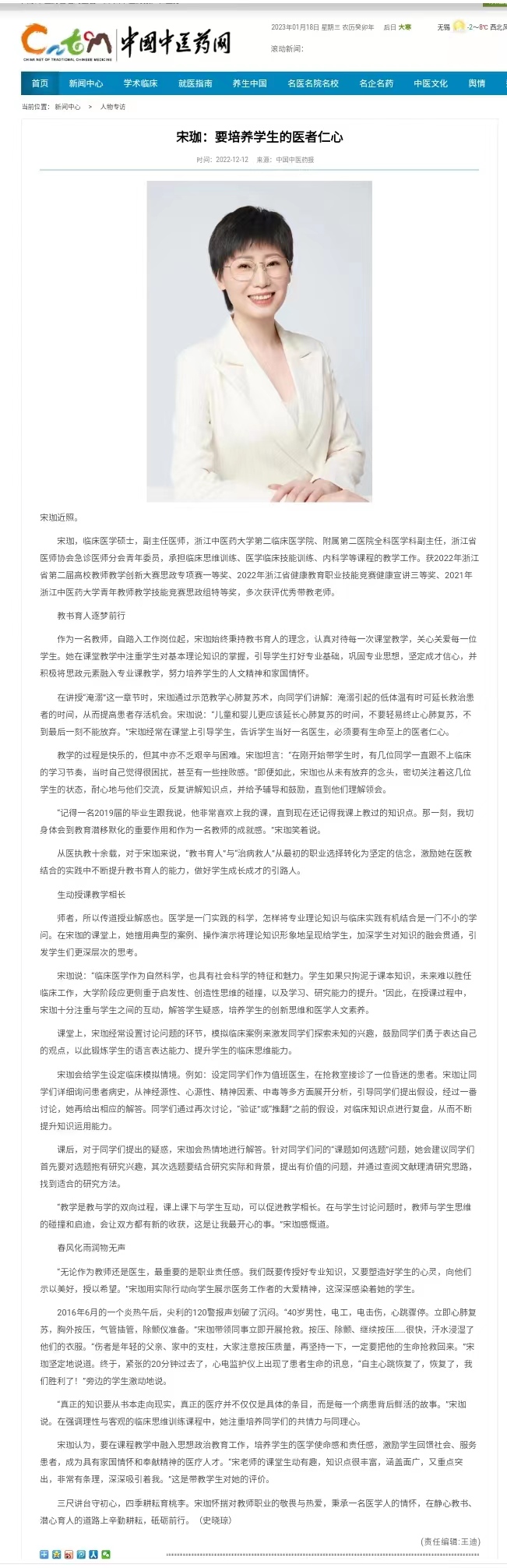 中国中医药报、中国中医药网:宋珈:要培养学生的医者仁心