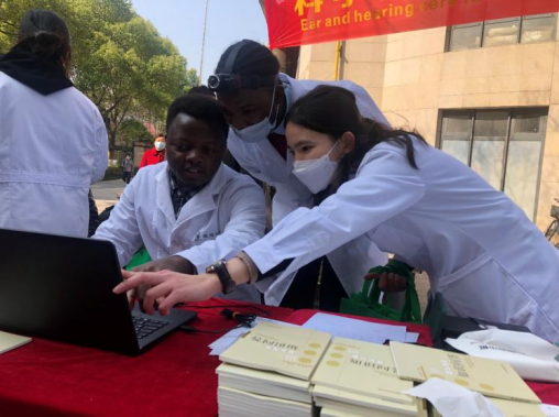 在活动现场,一位70多岁的老大爷,他有些焦虑地说道:“原本两只耳朵只有轻微的老年性听力下降,但是最近右耳突然有点听不见了。”赞比亚籍听力学硕士研究生Chobola Peter马上为大爷进行听力检测并给予有针对性的建议。