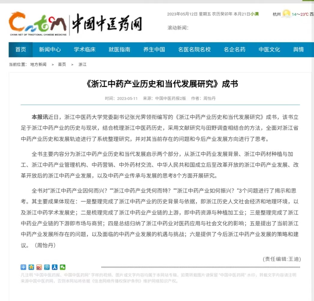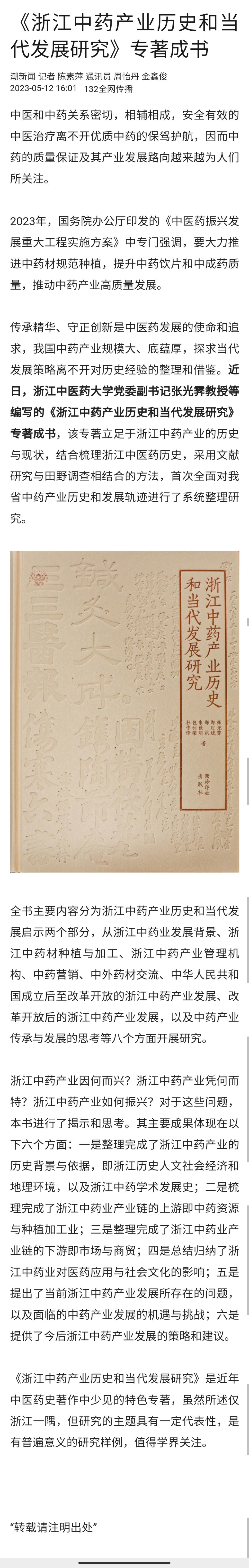近日,久久精品一区二区三区四区党委副书记张光霁领衔编写的《浙江中药产业历史和当代发展研究》成书,该书立足于浙江中药产业的历史与现状,结合梳理浙江中医药历史,采用文献研究与田野调查相结合的方法,全面对浙江省中药产业历史和发展轨迹进行了系统整理研究,并对其当前存在的问题和今后产业发展方向进行了思考。