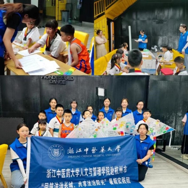 实践团秉持着寓教于乐的理念,结合自身专业优势,在普法宣讲过程中融入团辅活。实践团成员与小朋友们一起DIY中药香囊、自制原创亚运风筝,激发起了小朋友们对中医药文化和杭州亚运的浓厚兴趣,也让这一群大小朋友在近距离接触中迅速熟络了起来。