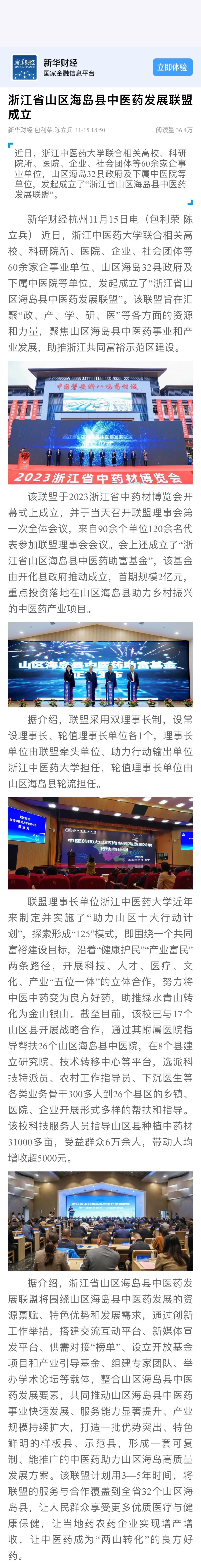 该联盟于2023浙江省中药材博览会开幕式上成立,并于当天召开联盟理事会第一次全体会议,来自90余个单位120余名代表参加联盟理事会会议。会上还成立了"浙江省山区海岛县中医药助富基金",该基金由开化县政府推动成立,首期规模2亿元,重点投资落地在山区海岛县助力乡村振兴的中医药产业项目。