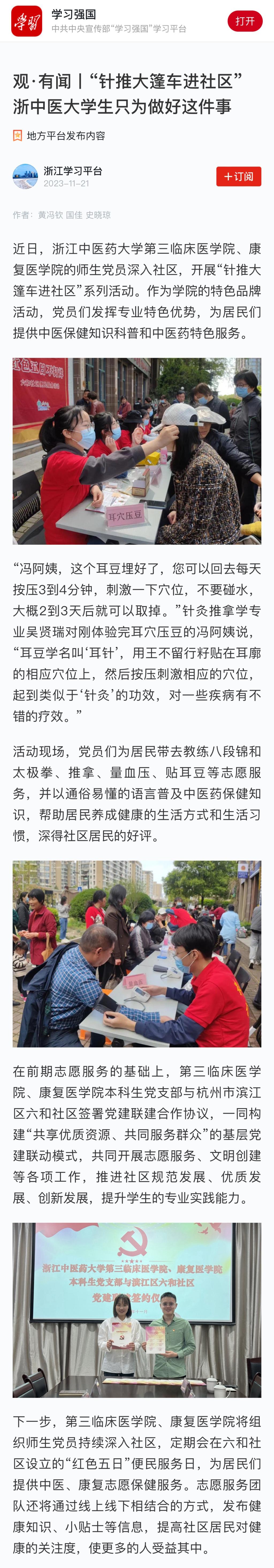 在前期志愿服务的基础上,第三临床医学院、康复医学院本科生党支部与杭州市滨江区六和社区签署党建联建合作协议,一同构建“共享优质资源、共同服务群众”的基层党建联动模式,共同开展志愿服务、文明创建等各项工作,推进社区规范发展、优质发展、创新发展,提升学生的专业实践能力。